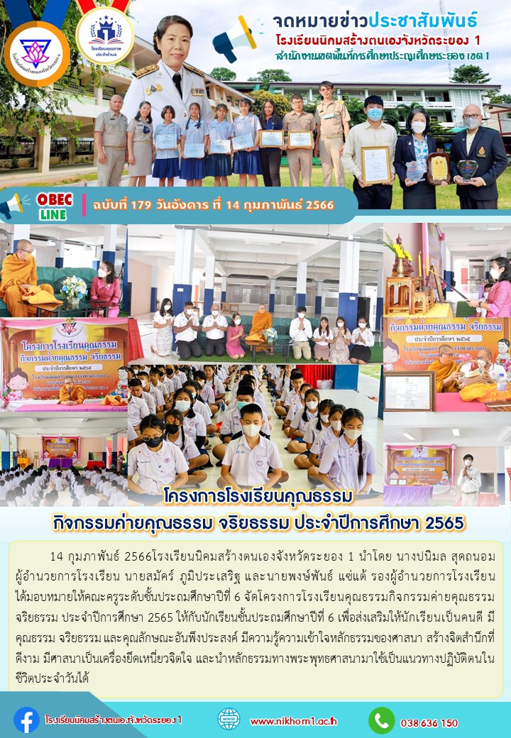 14 กุมภาพันธ์ 2566โรงเรียนนิคมสร้างตนเองจังหวัดระยอง 1 นำโดย นางปนิมล สุดถนอม ผู้อำนวยการโรงเรียน นายสมัคร์ ภูมิประเสริฐ และนายพงษ์พันธ์ แซ่แต้ รองผู้อำนวยการโรงเรียนได้มอบหมายให้คณะครูระดับชั้นประถมศึกษาปีที่ 6 จัดโครงการโรงเรียนคุณธรรมกิจกรรมค่ายคุณธรรม จริยธรรม ประจำปีการศึกษา 2565 ให้กับนักเรียนชั้นประถมศึกษาปีที่ 6 เพื่อส่งเสริมให้นักเรียนเป็นคนดี มีคุณธรรม จริยธรรม และคุณลักษณะอันพึงประสงค์ มีความรู้ความเข้าใจหลักธรรมของศาสนา สร้างจิตสำนึกที่ดีงาม มีศาสนาเป็นเครื่องยึดเหนี่ยวจิตใจ และนำหลักธรรมทางพระพุทธศาสนามาใช้เป็นแนวทางปฏิบัติตนในชีวิตประจำวันได้