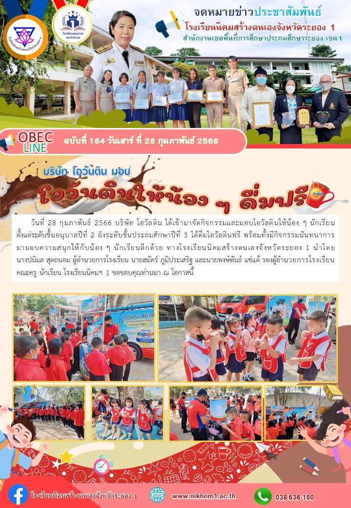 วันที่ 28 กุมภาพันธ์ 2566 บริษัท โอวัลติน ได้เข้ามาจัดกิจกรรมและมอบโอวัลตินให้น้อง ๆ นักเรียนตั้งแต่ระดับชั้นอนุบาลปีที่ 2 ถึงระดับชั้นประถมศึกษาปีที่ 3 ได้ดื่มโอวัลตินฟรี พร้อมทั้งมีกิจกรรมนันทนาการมามอบความสนุกให้กับน้อง ๆ นักเรียนอีกด้วย ทางโรงเรียนนิคมสร้างตนเองจังหวัดระยอง 1 นำโดย นางปนิมล สุดถนอม ผู้อำนวยการโรงเรียน นายสมัคร์ ภูมิประเสริฐ และนายพงษ์พันธ์ แซ่แต้ รองผู้อำนวยการโรงเรียน คณะครู นักเรียน โรงเรียนนิคมฯ 1 ขอขอบคุณท่านมา ณ โอกาสนี้