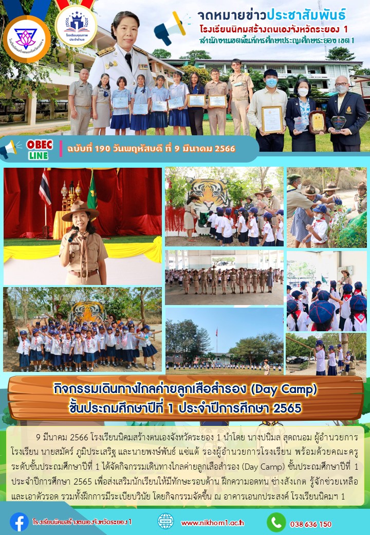9 มีนาคม 2566 โรงเรียนนิคมสร้างตนเองจังหวัดระยอง 1 นำโดย นางปนิมล สุดถนอม ผู้อำนวยการโรงเรียน นายสมัคร์ ภูมิประเสริฐ และนายพงษ์พันธ์ แซ่แต้ รองผู้อำนวยการโรงเรียน พร้อมด้วยคณะครูระดับชั้นประถมศึกษาปีที่ 1 ได้จัดกิจกรรมเดินทางไกลค่ายลูกเสือสำรอง (Day Camp) ชั้นประถมศึกษาปีที่ 1 ประจำปีการศึกษา 2565 เพื่อส่งเสริมนักเรียนให้มีทักษะรอบด้าน ฝึกความอดทน ช่างสังเกต รู้จักช่วยเหลือ และเอาตัวรอด รวมทั้งฝึกการมีระเบียบวินัย โดยกิจกรรมจัดขึ้น ณ ค่ายลูกเสือชั่วคราวโรงเรียนนิคมสร้างตนเองจังหวัดระยอง 1