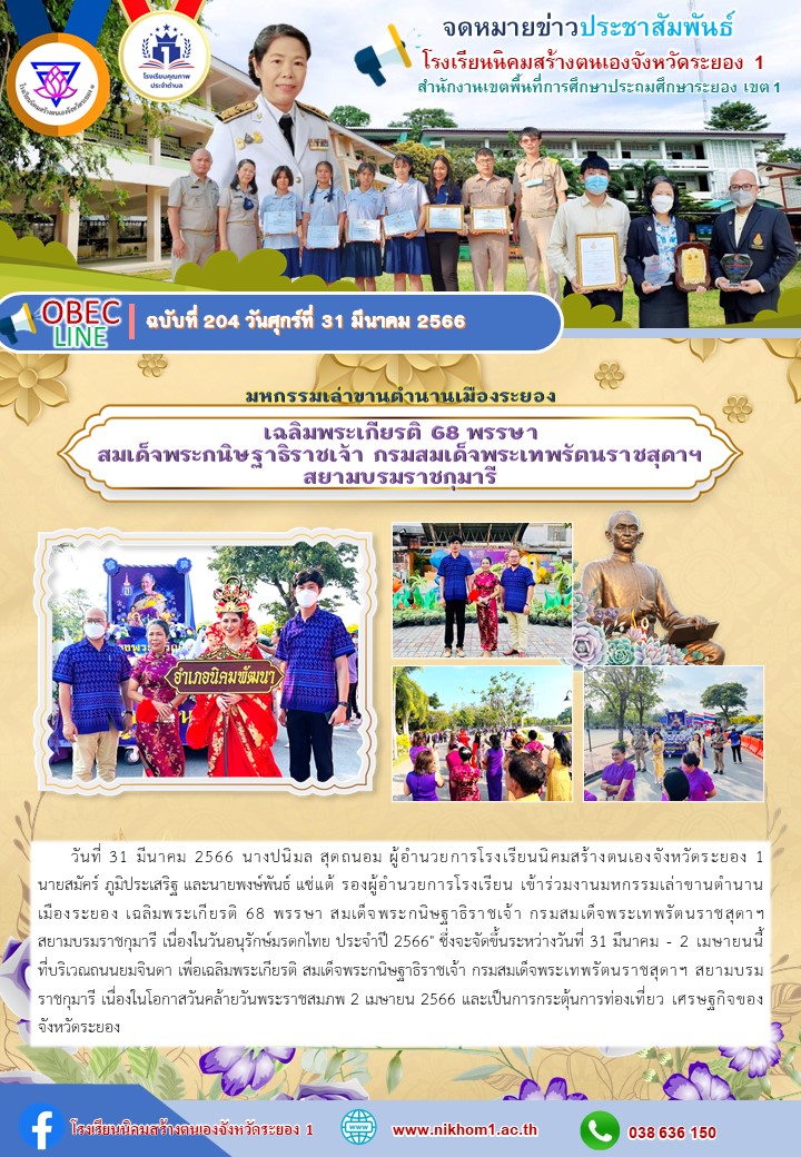 วันที่ 31 มีนาคม 2566 นางปนิมล สุดถนอม ผู้อำนวยการโรงเรียนนิคมสร้างตนเองจังหวัดระยอง 1 นายสมัคร์ ภูมิประเสริฐ และนายพงษ์พันธ์ แซ่แต้ รองผู้อำนวยการโรงเรียน เข้าร่วมงานมหกรรมเล่าขานตำนานเมืองระยอง เฉลิมพระเกียรติ 68 พรรษา สมเด็จพระกนิษฐาธิราชเจ้า กรมสมเด็จพระเทพรัตนราชสุดาฯ สยามบรมราชกุมารี เนื่องในวันอนุรักษ์มรดกไทย ประจำปี 2566" ซึ่งจะจัดขึ้นระหว่างวันที่ 31 มีนาคม - 2 เมษายนนี้ ที่บริเวณถนนยมจินดา เพื่อเฉลิมพระเกียรติ สมเด็จพระกนิษฐาธิราชเจ้า กรมสมเด็จพระเทพรัตนราชสุดาฯ สยามบรมราชกุมารี เนื่องในโอกาสวันคล้ายวันพระราชสมภพ 2 เมษายน 2566 และเป็นการกระตุ้นการท่องเที่ยว เศรษฐกิจของจังหวัดระยอง