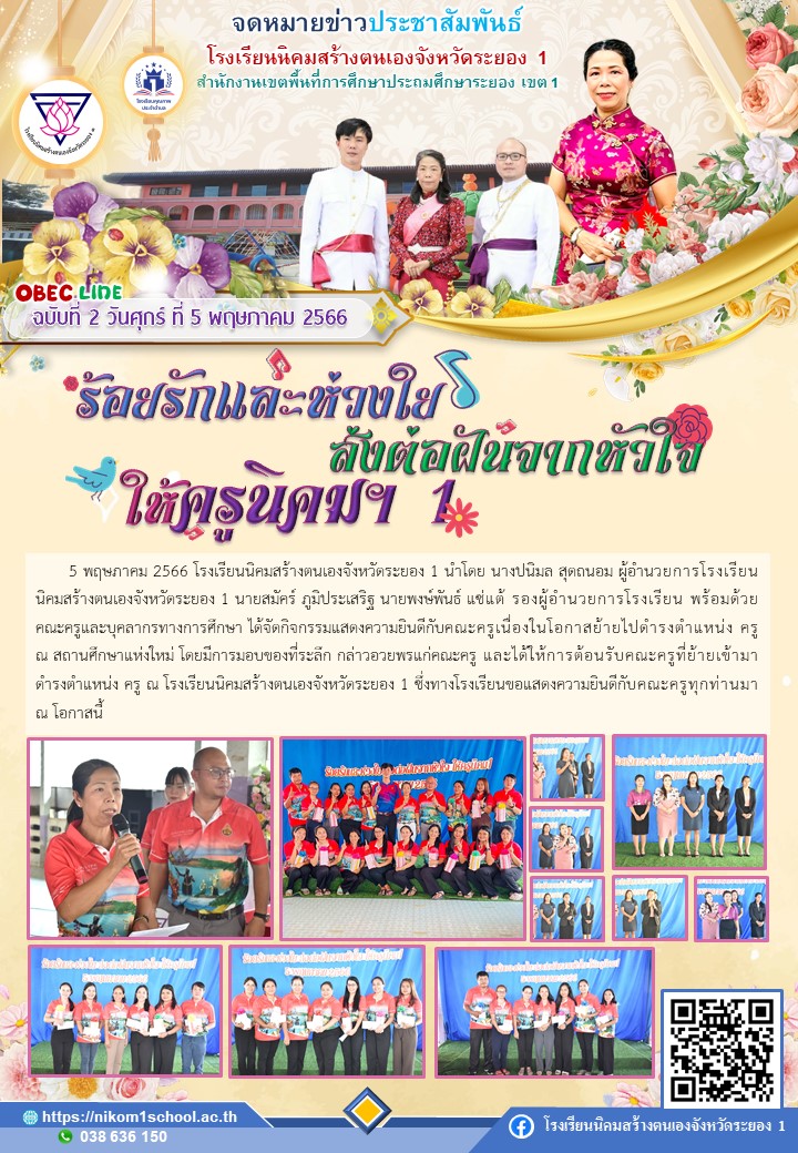 5 พฤษภาคม 2566 โรงเรียนนิคมสร้างตนเองจังหวัดระยอง 1 นำโดย นางปนิมล สุดถนอม ผู้อำนวยการโรงเรียนนิคมสร้างตนเองจังหวัดระยอง 1 นายสมัคร์ ภูมิประเสริฐ นายพงษ์พันธ์ แซ่แต้ รองผู้อำนวยการโรงเรียน ได้จัดกิจกรรมเลี้ยงส่งคณะครูในโอกาสย้ายไปปฏิบัติงานสถานศึกษาอื่นพร้อมมอบของที่ระลึกและกล่าวอวยพรแก่คณะครู และได้ให้การต้อนรับคณะครูที่ย้ายเข้ามาปฏิบัติงาน ณ โรงเรียนนิคมสร้างตนเองจังหวัดระยอง 1 ซึ่งทางโรงเรียนมีความยินดีอย่างยิ่งที่ได้บุคลากรที่มีคุณภาพเข้ามาร่วมเป็นส่วนหนึ่งของครอบครัว นิคมฯ 1 ในวันนี้