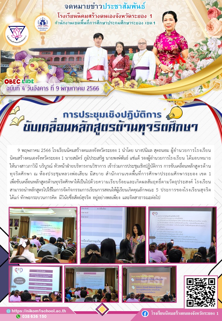 9 พฤษภาคม 2566 โรงเรียนนิคมสร้างตนเองจังหวัดระยอง 1 นำโดย นางปนิมล สุดถนอม ผู้อำนวยการโรงเรียนนิคมสร้างตนเองจังหวัดระยอง 1 นายสมัคร์ ภูมิประเสริฐ นายพงษ์พันธ์ แซ่แต้ รองผู้อำนวยการโรงเรียน ได้มอบหมายให้นางสาวภาวินี บริบูรณ์ หัวหน้าฝ่ายบริหารงานวิชาการ เข้าร่วมการประชุมเชิงปฏิบัติการ การขับเคลื่อนหลักสูตรต้านทุจริตศึกษา ณ ห้องประชุมหลวงพ่อเสียน มีสบาย สำนักงานเขตพื้นที่การศึกษาประถมศึกษาระยอง เขต 1 เพื่อขับเคลื่อนหลักสูตรต้านทุจริตศึกษาให้เป็นไปด้วยความเรียบร้อยและเกิดผลสัมฤทธิ์ตามวัตถุประสงค์ โรงเรียนสามารถนำหลักสูตรไปใช้ในการจัดกิจกรรมการเรียนการสอนให้ผู้เรียนเกิดคุณลักษณะ 5 ประการของโรงเรียนสุจริต ได้แก่ ทักษะกระบวนการคิด มีวินัยซื่อสัตย์สุจริต อยู่อย่างพอเพียง และจิตสาธารณะต่อไป
