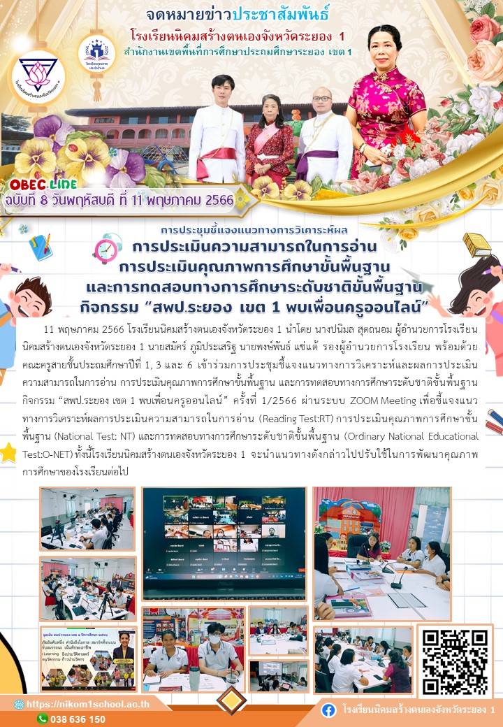 11 พฤษภาคม 2566 โรงเรียนนิคมสร้างตนเองจังหวัดระยอง 1 นำโดย นางปนิมล สุดถนอม ผู้อำนวยการโรงเรียนนิคมสร้างตนเองจังหวัดระยอง 1 นายสมัคร์ ภูมิประเสริฐ นายพงษ์พันธ์ แซ่แต้ รองผู้อำนวยการโรงเรียน พร้อมด้วยคณะครูสายชั้นประถมศึกษาปีที่ 1, 3 และ 6 เข้าร่วมการประชุมชี้แจงแนวทางการวิเคราะห์และผลการประเมินความสามารถในการอ่าน การประเมินคุณภาพการศึกษาขั้นพื้นฐาน และการทดสอบทางการศึกษาระดับชาติขั้นพื้นฐาน กิจกรรม “สพป.ระยอง เขต 1 พบเพื่อนครูออนไลน์” ครั้งที่ 1/2566 ผ่านระบบ ZOOM.Meeting.เพื่อชี้แจงแนวทางการวิเคราะห์ผลการประเมินความสามารถในการอ่าน (Reading.Test:RT).การประเมินคุณภาพการศึกษาขั้นพื้นฐาน (National Test: NT) และการทดสอบทางการศึกษาระดับชาติขั้นพื้นฐาน (Ordinary National Educational Test:O-NET).ทั้งนี้โรงเรียนนิคมสร้างตนเองจังหวัดระยอง 1 จะนำแนวทางดังกล่าวไปปรับใช้ในการพัฒนาคุณภาพการศึกษาของโรงเรียนต่อไป