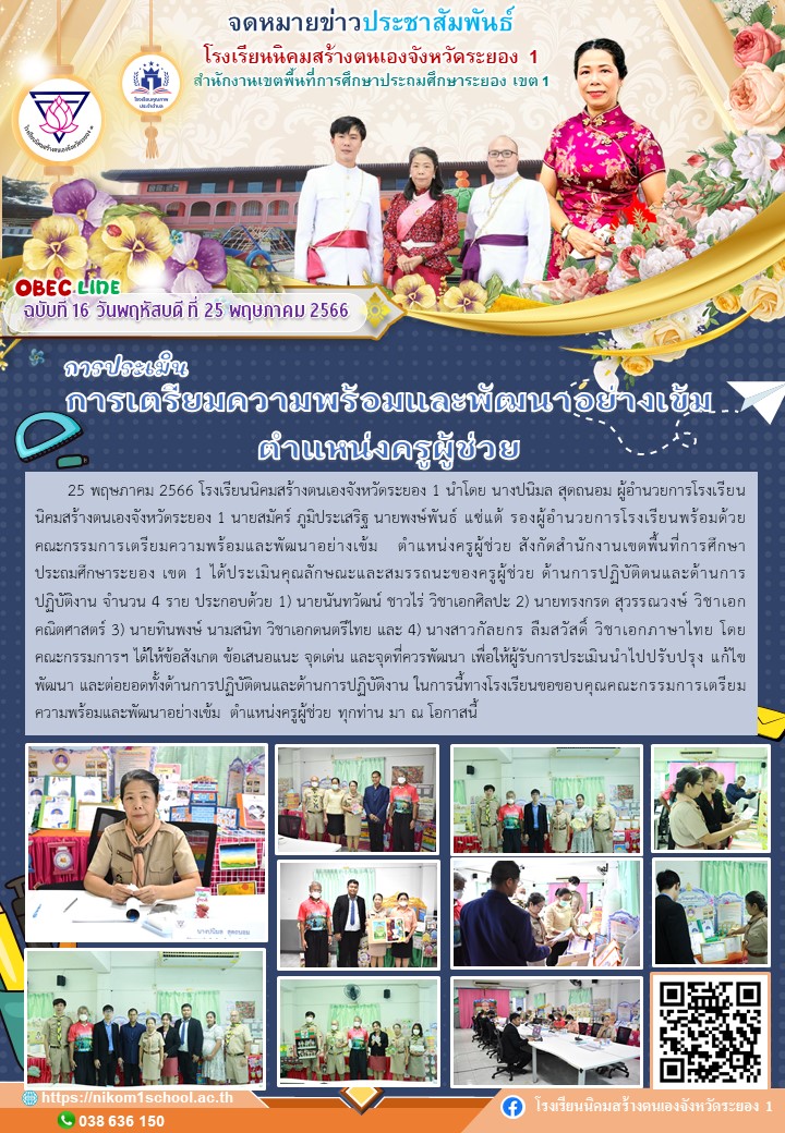 25 พฤษภาคม 2566 โรงเรียนนิคมสร้างตนเองจังหวัดระยอง 1 นำโดย นางปนิมล สุดถนอม ผู้อำนวยการโรงเรียนนิคมสร้างตนเองจังหวัดระยอง 1 นายสมัคร์ ภูมิประเสริฐ นายพงษ์พันธ์ แซ่แต้ รองผู้อำนวยการโรงเรียนพร้อมด้วยคณะกรรมการเตรียมความพร้อมและพัฒนาอย่างเข้ม ตำแหน่งครูผู้ช่วย สังกัดสำนักงานเขตพื้นที่การศึกษาประถมศึกษาระยอง เขต 1 ได้ประเมินคุณลักษณะและสมรรถนะของครูผู้ช่วย ด้านการปฏิบัติตนและด้านการปฏิบัติงาน จำนวน 4 ราย ประกอบด้วย 1) นายนันทวัฒน์ ชาวไร่ วิชาเอกศิลปะ 2) นายทรงกรด สุวรรณวงษ์ วิชาเอกคณิตศาสตร์ 3) นายทินพงษ์ นามสนิท วิชาเอกดนตรีไทย และ 4) นางสาวกัลยกร ลืมสวัสดิ์ วิชาเอกภาษาไทย โดยคณะกรรมการฯ ได้ให้ข้อสังเกต ข้อเสนอแนะ จุดเด่น และจุดที่ควรพัฒนา เพื่อให้ผู้รับการประเมินนำไปปรับปรุง แก้ไข พัฒนา และต่อยอดทั้งด้านการปฏิบัติตนและด้านการปฏิบัติงาน ในการนี้ทางโรงเรียนขอขอบคุณคณะกรรมการเตรียมความพร้อมและพัฒนาอย่างเข้ม ตำแหน่งครูผู้ช่วย ทุกท่าน มา ณ โอกาสนี้