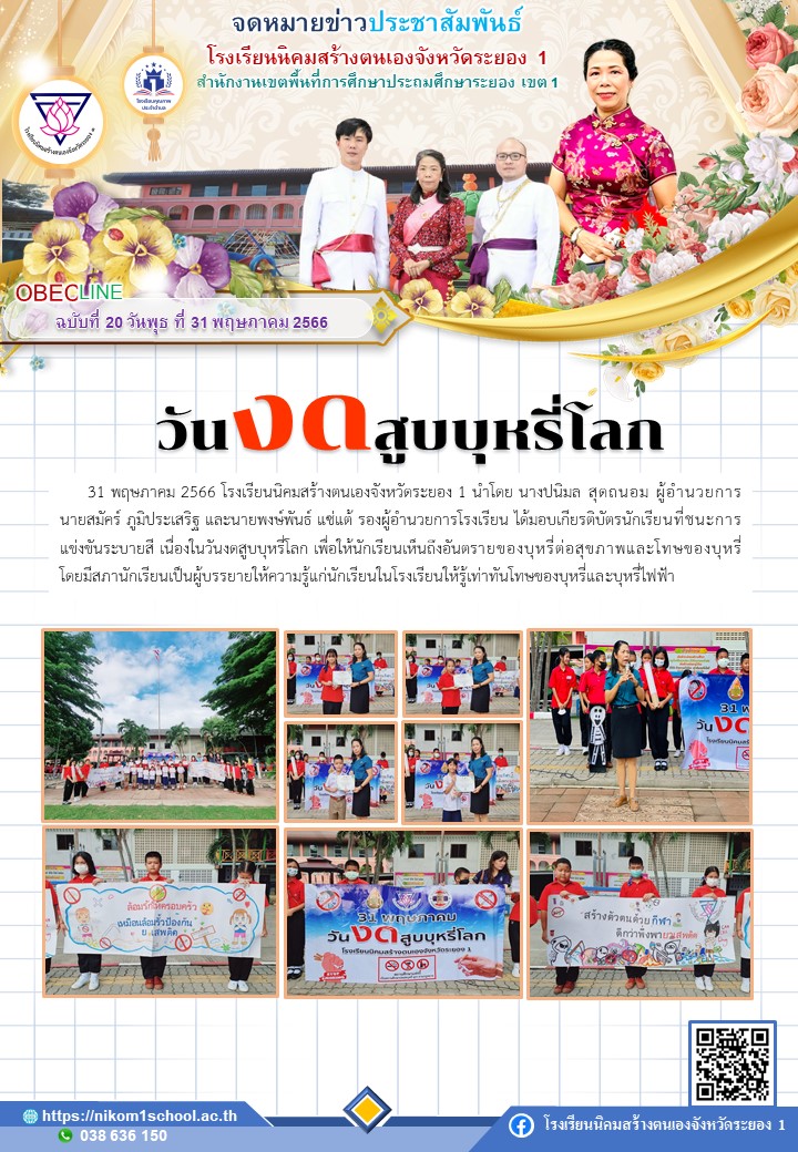 31 พฤษภาคม 2566 โรงเรียนนิคมสร้างตนเองจังหวัดระยอง 1 นำโดย นางปนิมล สุดถนอม ผู้อำนวยการ นายสมัคร์ ภูมิประเสริฐ และนายพงษ์พันธ์ แซ่แต้ รองผู้อำนวยการโรงเรียน ได้มอบเกียรติบัตรนักเรียนที่ชนะการแข่งขันระบายสี เนื่องในวันงดสูบบุหรี่โลก เพื่อให้นักเรียนเห็นถึงอันตรายของบุหรี่ต่อสุขภาพและโทษของบุหรี่ โดยมีสภานักเรียนเป็นผู้บรรยายให้ความรู้แก่นักเรียนในโรงเรียนให้รู้เท่าทันโทษของบุหรี่และบุหรี่ไฟฟ้า