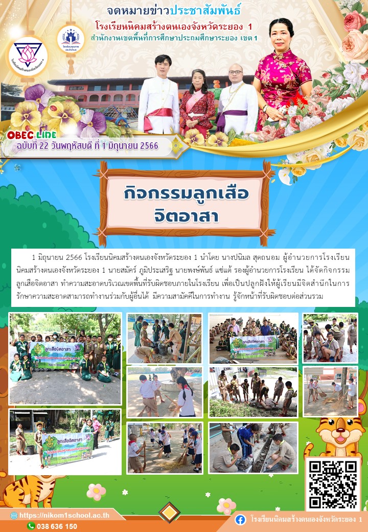 1 มิถุนายน 2566 โรงเรียนนิคมสร้างตนเองจังหวัดระยอง 1 นำโดย นางปนิมล สุดถนอม ผู้อำนวยการโรงเรียนนิคมสร้างตนเองจังหวัดระยอง 1 นายสมัคร์ ภูมิประเสริฐ นายพงษ์พันธ์ แซ่แต้ รองผู้อำนวยการโรงเรียน ได้จัดกิจกรรมลูกเสือจิตอาสา ทำความสะอาดบริเวณเขตพื้นที่รับผิดชอบภายในโรงเรียน เพื่อเป็นปลูกฝังให้ผู้เรียนมีจิตสำนึกในการรักษาความสะอาดสามารถทำงานร่วมกับผู้อื่นได้ มีความสามัคคีในการทำงาน รู้จักหน้าที่รับผิดชอบต่อส่วนรวม