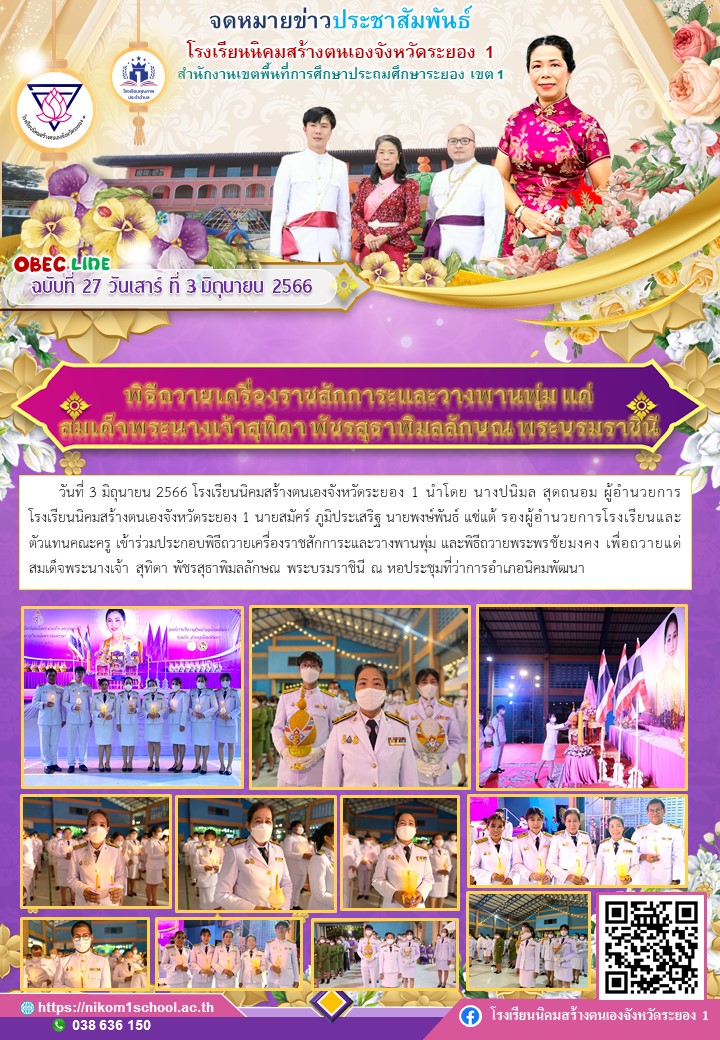 วันที่ 3 มิถุนายน 2566 โรงเรียนนิคมสร้างตนเองจังหวัดระยอง 1 นำโดย นางปนิมล สุดถนอม ผู้อำนวยการโรงเรียนนิคมสร้างตนเองจังหวัดระยอง 1 นายสมัคร์ ภูมิประเสริฐ นายพงษ์พันธ์ แซ่แต้ รองผู้อำนวยการโรงเรียนและตัวแทนคณะครู เข้าร่วมประกอบพิธีถวายเครื่องราชสักการะและวางพานพุ่ม และพิธีถวายพระพรชัยมงคง เพื่อถวายแด่สมเด็จพระนางเจ้า สุทิดา พัชรสุธาพิมลลักษณ พระบรมราชินี ณ หอประชุมที่ว่าการอำเภอนิคมพัฒนา