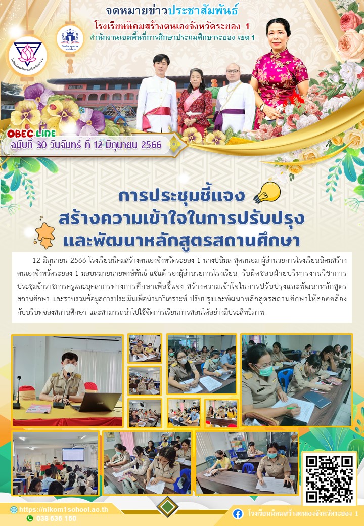 12 มิถุนายน 2566 โรงเรียนนิคมสร้างตนเองจังหวัดระยอง 1 นางปนิมล สุดถนอม ผู้อำนวยการโรงเรียนนิคมสร้างตนเองจังหวัดระยอง 1 มอบหมายนายพงษ์พันธ์ แซ่แต้ รองผู้อำนวยการโรงเรียน รับผิดชอบฝ่ายบริหารงานวิชาการ ประชุมข้าราชการครูและบุคลากรทางการศึกษาเพื่อชี้แจง สร้างความเข้าใจในการปรับปรุงและพัฒนาหลักสูตรสถานศึกษา และรวบรวมข้อมูลการประเมินเพื่อนำมาวิเคราะห์ ปรับปรุงและพัฒนาหลักสูตรสถานศึกษาให้สอดคล้องกับบริบทของสถานศึกษา และสามารถนำไปใช้จัดการเรียนการสอนได้อย่างมีประสิทธิภาพ