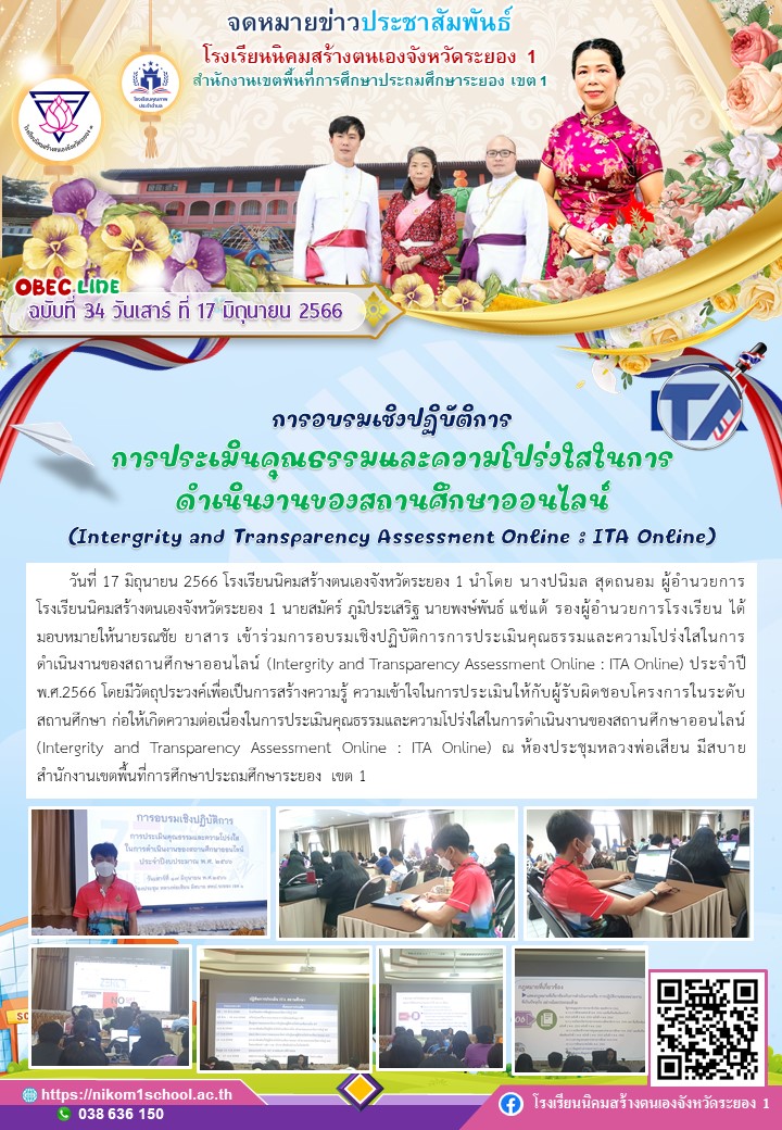 วันที่ 17 มิถุนายน 2566 โรงเรียนนิคมสร้างตนเองจังหวัดระยอง 1 นำโดย นางปนิมล สุดถนอม ผู้อำนวยการโรงเรียนนิคมสร้างตนเองจังหวัดระยอง 1 นายสมัคร์ ภูมิประเสริฐ นายพงษ์พันธ์ แซ่แต้ รองผู้อำนวยการโรงเรียน ได้มอบหมายให้นายรณชัย ยาสาร เข้าร่วมการอบรมเชิงปฏิบัติการการประเมินคุณธรรมและความโปร่งใสในการดำเนินงานของสถานศึกษาออนไลน์ (Intergrity and Transparency Assessment Online : ITA Online) ประจำปี พ.ศ.2566 โดยมีวัตถุประวงค์เพื่อเป็นการสร้างความรู้ ความเข้าใจในการประเมินให้กับผู้รับผิดชอบโครงการในระดับสถานศึกษา ก่อให้เกิดความต่อเนื่องในการประเมินคุณธรรมและความโปร่งใสในการดำเนินงานของสถานศึกษาออนไลน์ (Intergrity and Transparency Assessment Online : ITA Online) ณ ห้องประชุมหลวงพ่อเสียน มีสบาย สำนักงานเขตพื้นที่การศึกษาประถมศึกษาระยอง เขต 1