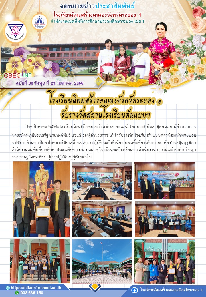 23 สิงหาคม 2566 โรงเรียนนิคมสร้างตนเองจังหวัดระยอง 1 นำโดยนางปนิมล สุดถนอม ผู้อำนวยการ  นายสมัคร์ ภูมิประเสริฐ นายพงษ์พันธ์ แซ่แต้ รองผู้อำนวยการ ได้เข้ารับรางวัล โรงเรียนต้นแบบการน้อมนำพระบรมราโชบายด้านการศึกษาในหลวงรัชกาลที่ 10 สู่การปฏิบัติ ระดับสำนักงานเขตพื้นที่การศึกษา ณ  ห้องประชุมคุรุสภา สำนักงานเขตพื้นที่การศึกษาประถมศึกษาระยอง เขต 1 โรงเรียนจะขับเคลื่อนการดำเนินงาน การน้อมนำหลักปรัชญาของเศรษฐกิจพอเพียง สู่การปฏิบัติลงสู่ผู้เรียนต่อไป