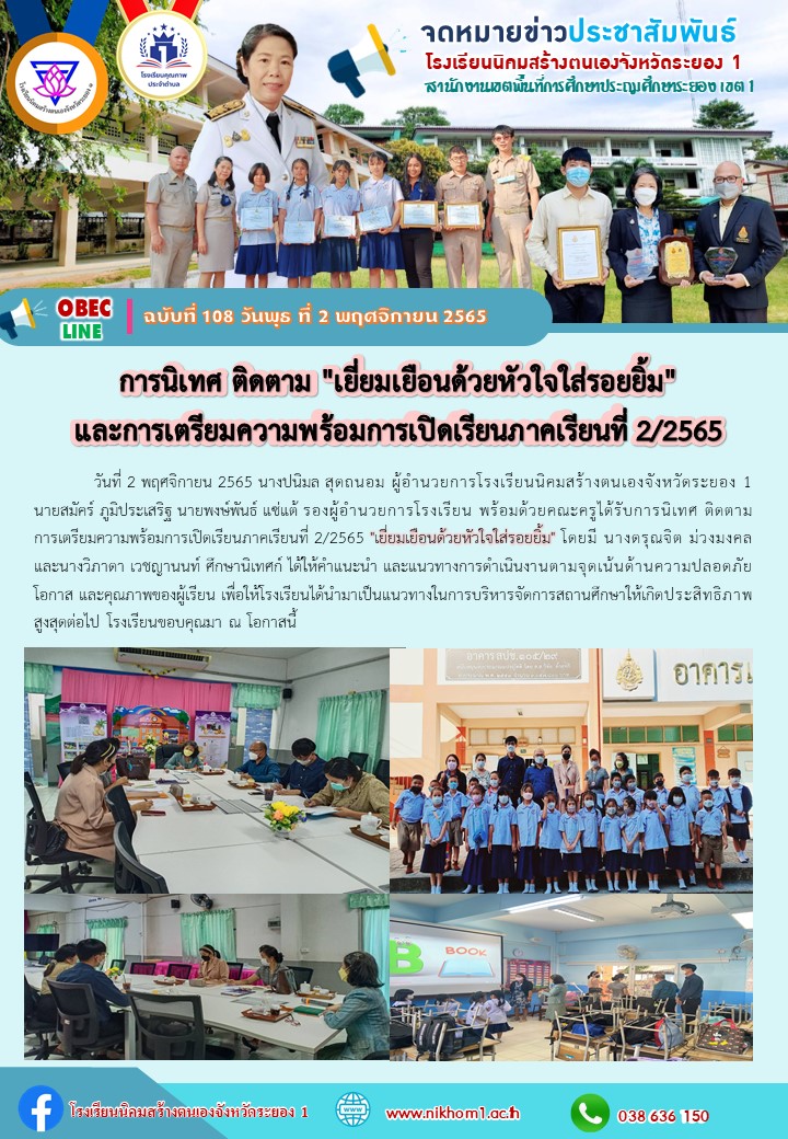 วันที่ 2 พฤศจิกายน 2565 นางปนิมล สุดถนอม ผู้อำนวยการโรงเรียนนิคมสร้างตนเองจังหวัดระยอง 1 นายสมัคร์ ภูมิประเสริฐ นายพงษ์พันธ์ แซ่แต้ รองผู้อำนวยการโรงเรียน พร้อมด้วยคณะครูได้รับการนิเทศ ติดตาม การเตรียมความพร้อมการเปิดเรียนภาคเรียนที่ 2/2565 "เยี่ยมเยือนด้วยหัวใจใส่รอยยิ้ม" โดยมี นางดรุณจิต ม่วงมงคล และนางวิภาดา เวชญานนท์ ศึกษานิเทศก์ ได้ให้คำแนะนำ และแนวทางการดำเนินงานตามจุดเน้นด้านความปลอดภัย โอกาส และคุณภาพของผู้เรียน เพื่อให้โรงเรียนได้นำมาเป็นแนวทางในการบริหารจัดการสถานศึกษาให้เกิดประสิทธิภาพสูงสุดต่อไป โรงเรียนขอบคุณมา ณ โอกาสนี้