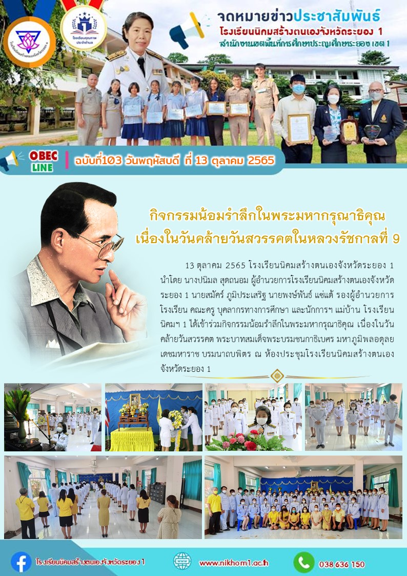 13 ตุลาคม 2565 โรงเรียนนิคมสร้างตนเองจังหวัดระยอง 1 นำโดย นางปนิมล สุดถนอม ผู้อำนวยการโรงเรียนนิคมสร้างตนเองจังหวัดระยอง 1 นายสมัคร์ ภูมิประเสริฐ นายพงษ์พันธ์ แซ่แต้ รองผู้อำนวยการโรงเรียน คณะครู บุคลากรทางการศึกษา และนักการฯ แม่บ้าน โรงเรียนนิคมฯ 1 ได้เข้าร่วมกิจกรรมน้อมรำลึกในพระมหากรุณาธิคุณ เนื่องในวันคล้ายวันสวรรคต พระบาทสมเด็จพระบรมชนกาธิเบศร มหาภูมิพลอดุลยเดชมหาราช บรมนาถบพิตร ณ ห้องประชุมโรงเรียนนิคมสร้างตนเองจังหวัดระยอง 1