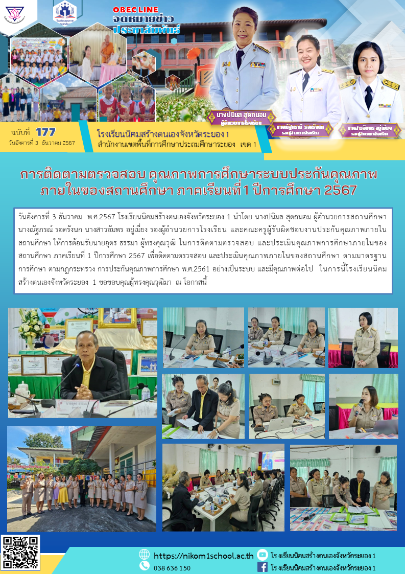 การติดตามตรวจสอบ และประเมินคุณภาพการศึกษาภายในของสถานศึกษา ภาคเรียนที่ 1 ปีการศึกษา 2567