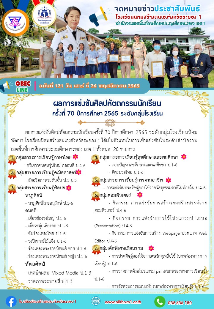 ผลการแข่งขันศิลปหัตถกรรมนักเรียนครั้งที่ 70 ปีการศึกษา 2565 ระดับกลุ่มโรงเรียนนิคมพัฒนา โรงเรียนนิคมสร้างตนเองจังหวัดระยอง 1 ได้เป็นตัวแทนในการเข้าแข่งขันในระดับสำนักงานเขตพื้นที่การศึกษาประถมศึกษาระยอง เขต 1 ทั้งหมด 20 รายการ