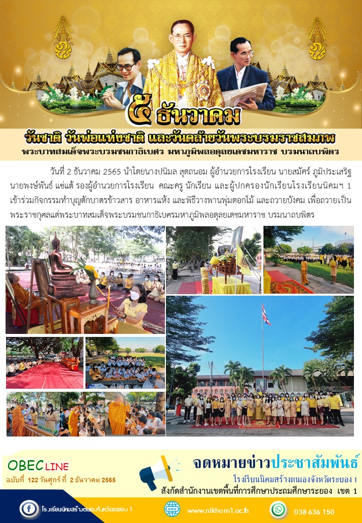 วันที่ 2 ธันวาคม 2565 นำโดยนางปนิมล สุดถนอม ผู้อำนวยการโรงเรียน นายสมัคร์ ภูมิประเสริฐ นายพงษ์พันธ์ แซ่แต้ รองผู้อำนวยการโรงเรียน คณะครู นักเรียน และผู้ปกครองนักเรียนโรงเรียนนิคมฯ 1 เข้าร่วมกิจกรรมทำบุญตักบาตรข้าวสาร อาหารแห้ง และพิธีวางพานพุ่มดอกไม้ และถวายบังคม เพื่อถวายเป็นพระราชกุศลแด่พระบาทสมเด็จพระบรมชนกาธิเบศรมหาภูมิพลอดุลยเดชมหาราช บรมนาถบพิตร