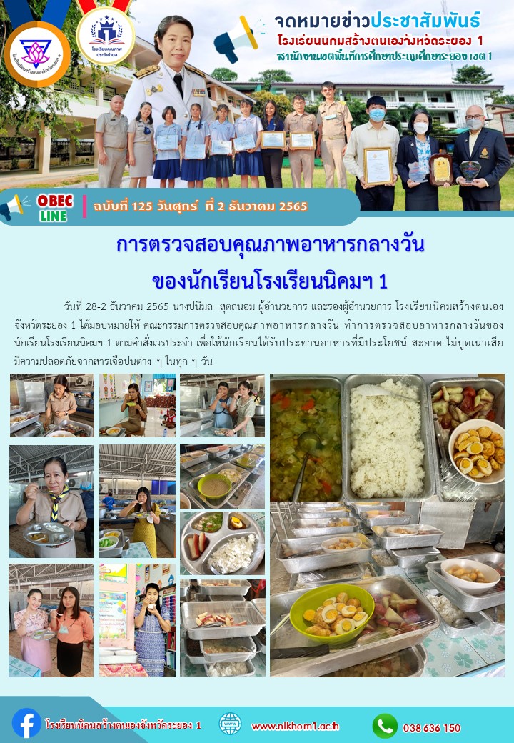 วันที่ 28-2 ธันวาคม 2565 นางปนิมล สุดถนอม ผู้อำนวยการ และรองผู้อำนวยการ โรงเรียนนิคมสร้างตนเองจังหวัดระยอง 1 ได้มอบหมายให้ คณะกรรมการตรวจสอบคุณภาพอาหารกลางวัน ทำการตรวจสอบอาหารกลางวันของนักเรียนโรงเรียนนิคมฯ 1 ตามคำสั่งเวรประจำ เพื่อให้นักเรียนได้รับประทานอาหารที่มีประโยชน์ สะอาด ไม่บูดเน่าเสีย มีความปลอดภัยจากสารเจือปนต่าง ๆ ในทุก ๆ วัน