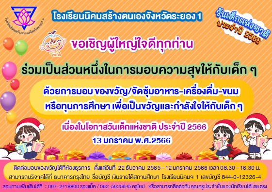 ขอเรียนเชิญผู้ใหญ่ใจดีทุก ๆท่าน ร่วมเป็นส่วนหนึ่งในการมอบความสุขให้กับเด็กๆ ด้วยการมอบ "ของขวัญ/จัดซุ้มอาหาร-เครื่องดื่ม-ขนม/ทุนการศึกษา" เพื่อเป็นขวัญและกำลังใจให้กับเด็ก ๆ "เนื่องในวันเด็กแห่งชาติ ประจำปี 2566" โดยโรงเรียนจะจัดกิจกรรม "วันเด็กแห่งชาติ" ขึ้นในวันศุกร์ที่ 13 มกราคม 2566