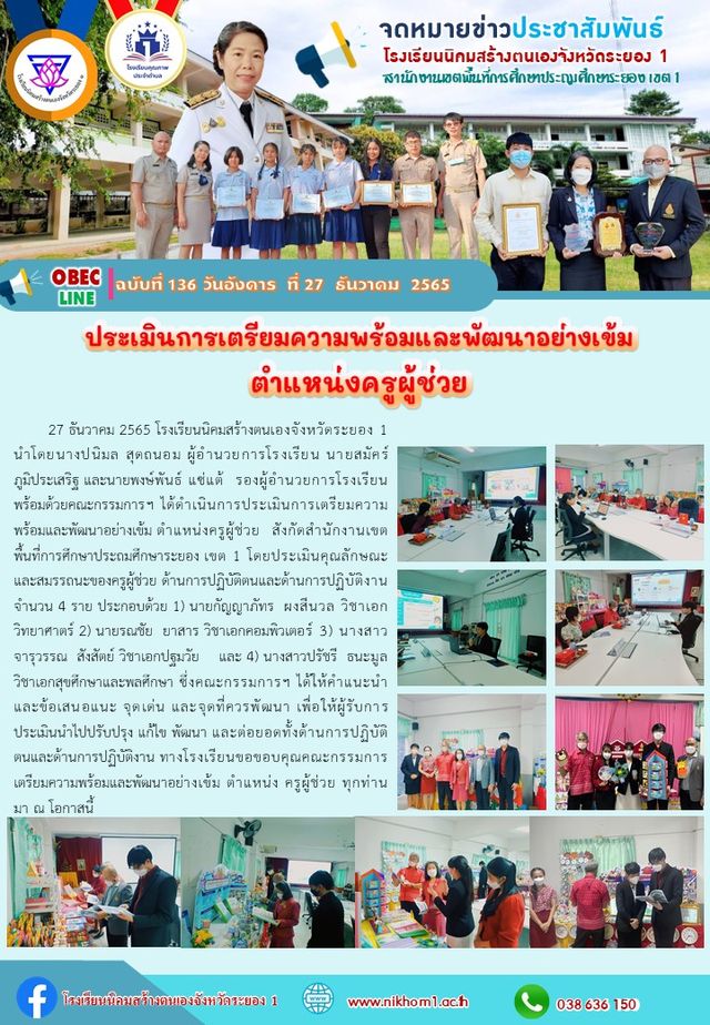 27 ธันวาคม 2565 โรงเรียนนิคมสร้างตนเองจังหวัดระยอง 1 นำโดยนางปนิมล สุดถนอม ผู้อำนวยการโรงเรียน นายสมัคร์ ภูมิประเสริฐ และนายพงษ์พันธ์ แซ่แต้ รองผู้อำนวยการโรงเรียน พร้อมด้วยคณะกรรมการฯ ได้ดำเนินการประเมินการเตรียมความพร้อมและพัฒนาอย่างเข้ม ตำแหน่งครูผู้ช่วย สังกัดสำนักงานเขตพื้นที่การศึกษาประถมศึกษาระยอง เขต 1 โดยประเมินคุณลักษณะและสมรรถนะของครูผู้ช่วย ด้านการปฏิบัติตนและด้านการปฏิบัติงาน จำนวน 4 ราย ประกอบด้วย 1) นายกัญญาภัทร ผงสีนวล วิชาเอกวิทยาศาตร์ 2) นายรณชัย ยาสาร วิชาเอกคอมพิวเตอร์ 3) นางสาวจารุวรรณ สังสัตย์ วิชาเอกปฐมวัย และ 4) นางสาวปรัชรี ธนะมูล วิชาเอกสุขศึกษาและพลศึกษา ซึ่งคณะกรรมการฯ ได้ให้คำแนะนำและข้อเสนอแนะ จุดเด่น และจุดที่ควรพัฒนา เพื่อให้ผู้รับการประเมินนำไปปรับปรุง แก้ไข พัฒนา และต่อยอดทั้งด้านการปฏิบัติตนและด้านการปฏิบัติงาน ทางโรงเรียนขอขอบคุณคณะกรรมการเตรียมความพร้อมและพัฒนาอย่างเข้ม ตำแหน่ง ครูผู้ช่วย ทุกท่าน มา ณ โอกาสนี้