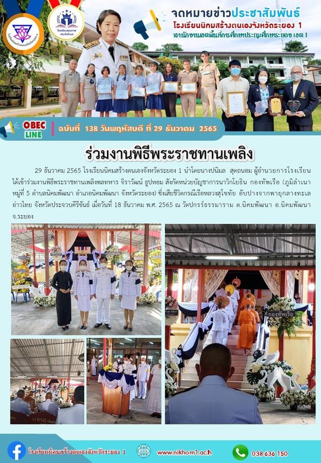29 ธันวาคม 2565 โรงเรียนนิคมสร้างตนเองจังหวัดระยอง 1 นำโดยนางปนิมล สุดถนอม ผู้อำนวยการโรงเรียน ได้เข้าร่วมงานพิธีพระราชทานเพลิงพลทหาร จิราวัฒน์ ธูปหอม สังกัดหน่วยบัญชาการนาวิกโยธิน กองทัพเรือ (ภูมิลำเนา หมู่ที่ 5 ตำบลนิคมพัฒนา อำเภอนิคมพัฒนา จังหวัดระยอง) ซึ่งเสียชีวิตกรณีเรือหลวงสุโขทัย อับปางจากพายุกลางทะเลอ่าวไทย จังหวัดประจวบคีรีขันธ์ เมื่อวันที่ 18 ธันวาคม พ.ศ. 2565 ณ วัดปกรร์ธรรมาราม ต.นิคมพัฒนา อ.นิคมพัฒนา จ.ระยอง
