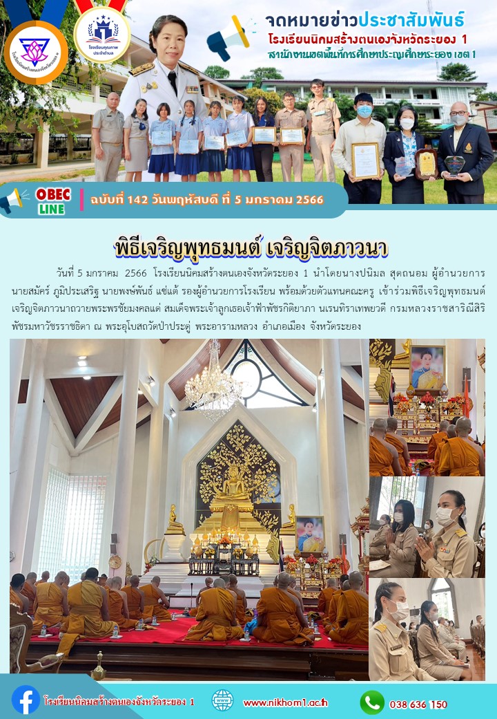 วันที่ 5 มกราคม 2566 โรงเรียนนิคมสร้างตนเองจังหวัดระยอง 1 นำโดยนางปนิมล สุดถนอม ผู้อำนวยการ นายสมัคร์ ภูมิประเสริฐ นายพงษ์พันธ์ แซ่แต้ รองผู้อำนวยการโรงเรียน พร้อมด้วยตัวแทนคณะครู เข้าร่วมพิธีเจริญพุทธมนต์ เจริญจิตภาวนาถวายพระพรชัยมงคลแด่ สมเด็จพระเจ้าลูกเธอเจ้าฟ้าพัชรกิติยาภา นเรนทิราเทพยวดี กรมหลวงราชสาริณีสิริพัชรมหาวัชรราชธิดา ณ พระอุโบสถวัดป่าประดู่ พระอารามหลวง อำเภอเมือง จังหวัดระยอง