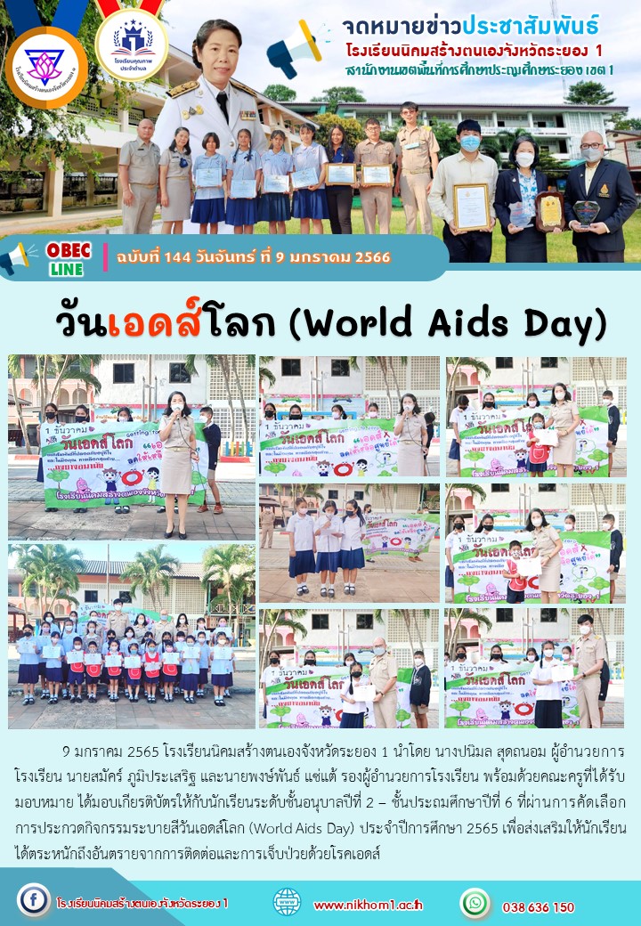 9 มกราคม 2565 โรงเรียนนิคมสร้างตนเองจังหวัดระยอง 1 นำโดย นางปนิมล สุดถนอม ผู้อำนวยการโรงเรียน นายสมัคร์ ภูมิประเสริฐ และนายพงษ์พันธ์ แซ่แต้ รองผู้อำนวยการโรงเรียน พร้อมด้วยคณะครูที่ได้รับมอบหมาย ได้มอบเกียรติบัตรให้กับนักเรียนระดับชั้นอนุบาลปีที่ 2 – ชั้นประถมศึกษาปีที่ 6 ที่ผ่านการคัดเลือกการประกวดกิจกรรมระบายสีวันเอดส์โลก (World Aids Day) ประจำปีการศึกษา 2565 เพื่อส่งเสริมให้นักเรียนได้ตระหนักถึงอันตรายจากการติดต่อและการเจ็บป่วยด้วยโรคเอดส์