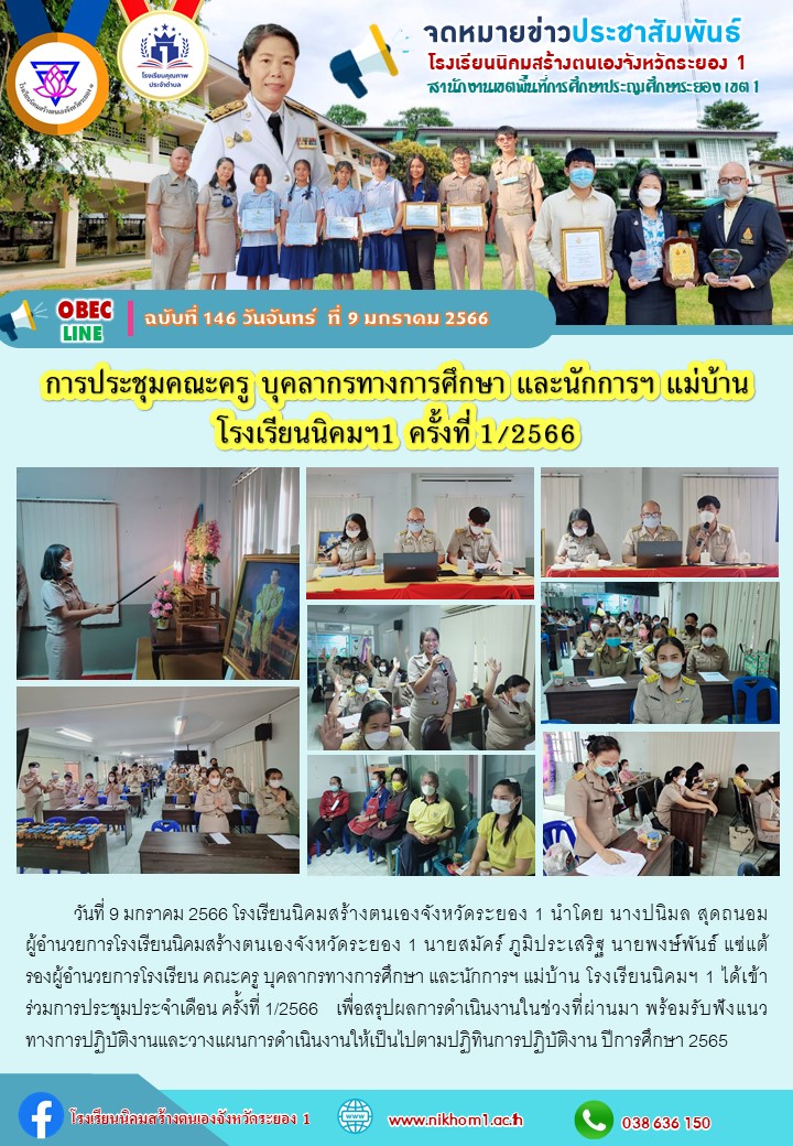 วันที่ 9 มกราคม 2566 โรงเรียนนิคมสร้างตนเองจังหวัดระยอง 1 นำโดย นางปนิมล สุดถนอม ผู้อำนวยการโรงเรียนนิคมสร้างตนเองจังหวัดระยอง 1 นายสมัคร์ ภูมิประเสริฐ นายพงษ์พันธ์ แซ่แต้ รองผู้อำนวยการโรงเรียน คณะครู บุคลากรทางการศึกษา และนักการฯ แม่บ้าน โรงเรียนนิคมฯ 1 ได้เข้าร่วมการประชุมประจำเดือน ครั้งที่ 1/2566 เพื่อสรุปผลการดำเนินงานในช่วงที่ผ่านมา พร้อมรับฟังแนวทางการปฏิบัติงานและวางแผนการดำเนินงานให้เป็นไปตามปฏิทินการปฏิบัติงาน ปีการศึกษา 2565