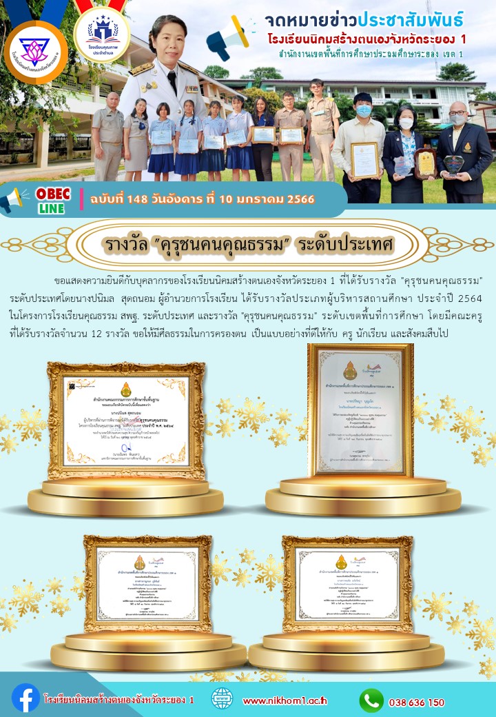 ขอแสดงความยินดีกับบุคลากรของโรงเรียนนิคมสร้างตนเองจังหวัดระยอง 1 ที่ได้รับรางวัล "คุรุชนคนคุณธรรม" ระดับประเทศโดยนางปนิมล สุดถนอม ผู้อำนวยการโรงเรียน ได้รับรางวัลประเภทผู้บริหารสถานศึกษา ประจำปี 2564 ในโครงการโรงเรียนคุณธรรม สพฐ. ระดับประเทศ และรางวัล "คุรุชนคนคุณธรรม" ระดับเขตพื้นที่การศึกษา โดยมีคณะครู ที่ได้รับรางวัลจำนวน 12 รางวัล ขอให้มีศีลธรรมในการครองตน เป็นแบบอย่างที่ดีให้กับ ครู นักเรียน และสังคมสืบไป