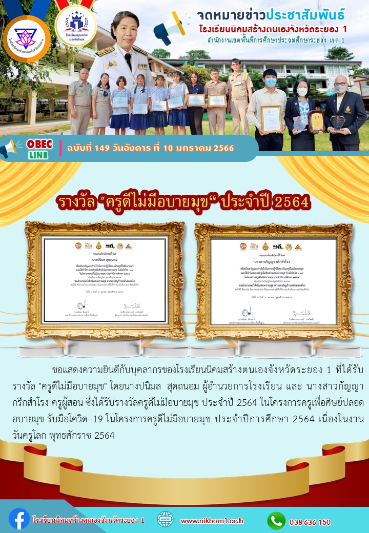 ขอแสดงความยินดีกับบุคลากรของโรงเรียนนิคมสร้างตนเองจังหวัดระยอง 1 ที่ได้รับรางวัล "ครูดีไม่มีอบายมุข" โดยนางปนิมล สุดถนอม ผู้อำนวยการโรงเรียน และ นางสาวกัญญา กรึกสำโรง ครูผู้สอน ซึ่งได้รับรางวัลครูดีไม่มีอบายมุข ประจำปี 2564 ในโครงการครูเพื่อศิษย์ปลอดอบายมุข รับมือโควิด–19 ในโครงการครูดีไม่มีอบายมุข ประจำปีการศึกษา 2564 เนื่องในงานวันครูโลก พุทธศักราช 2564