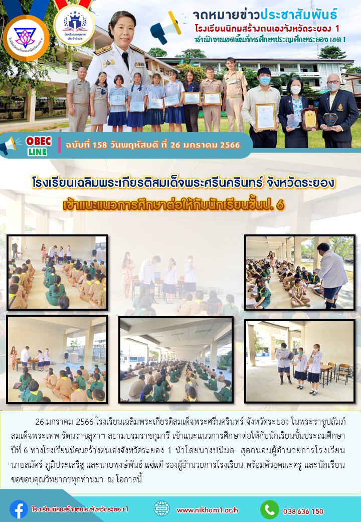 โรงเรียนเฉลิมพระเกียรติสมเด็จพระศรีนครินทร์ จังหวัดระยอง ในพระราชูปถัมภ์สมเด็จพระเทพ รัตนราชสุดาฯ สยามบรมราชกุมารี เข้าแนะแนวการศึกษาต่อให้กับนักเรียนชั้นประถมศึกษาปีที่ 6