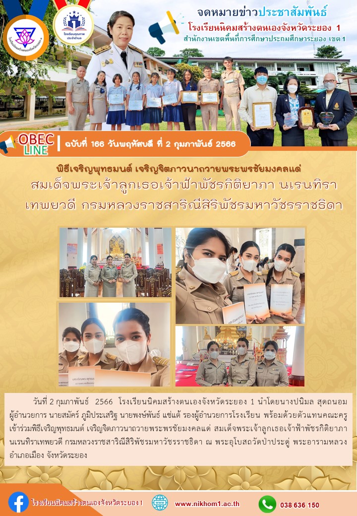 วันที่ 2 กุมภาพันธ์ 2566 โรงเรียนนิคมสร้างตนเองจังหวัดระยอง 1 นำโดยนางปนิมล สุดถนอม ผู้อำนวยการ นายสมัคร์ ภูมิประเสริฐ นายพงษ์พันธ์ แซ่แต้ รองผู้อำนวยการโรงเรียน พร้อมด้วยตัวแทนคณะครู เข้าร่วมพิธีเจริญพุทธมนต์ เจริญจิตภาวนาถวายพระพรชัยมงคลแด่ สมเด็จพระเจ้าลูกเธอเจ้าฟ้าพัชรกิติยาภา นเรนทิราเทพยวดี กรมหลวงราชสาริณีสิริพัชรมหาวัชรราชธิดา ณ พระอุโบสถวัดป่าประดู่ พระอารามหลวง อำเภอเมือง จังหวัดระยอง