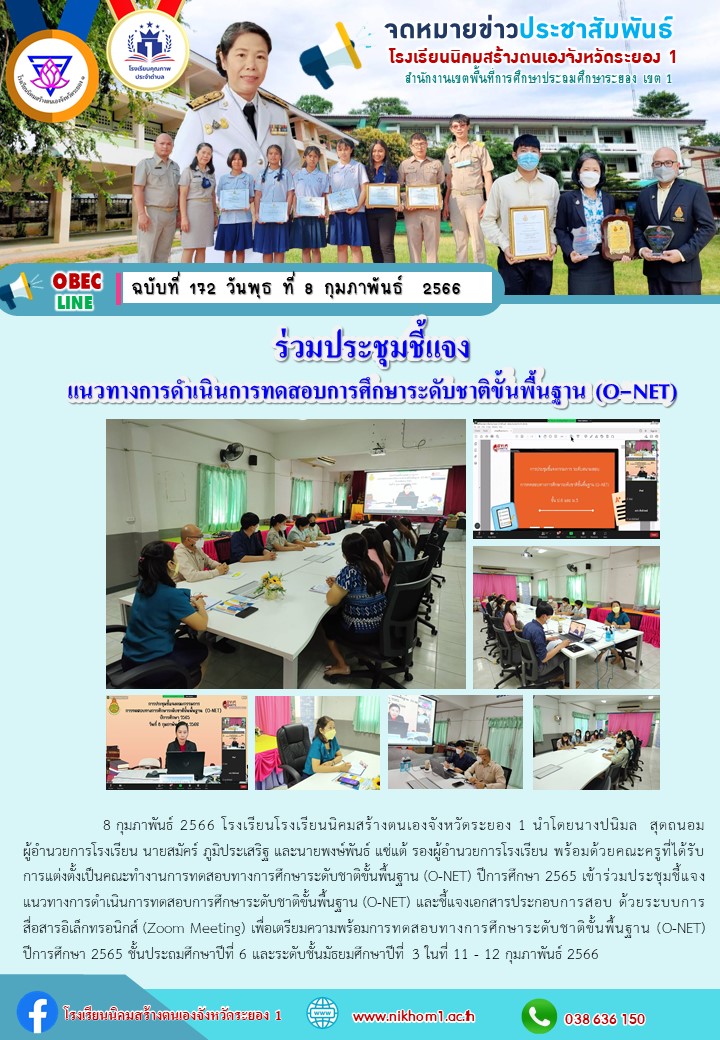 8 กุมภาพันธ์ 2566 โรงเรียนโรงเรียนนิคมสร้างตนเองจังหวัดระยอง 1 นำโดยนางปนิมล สุดถนอมผู้อำนวยการโรงเรียน นายสมัคร์ ภูมิประเสริฐ และนายพงษ์พันธ์ แซ่แต้ รองผู้อำนวยการโรงเรียน พร้อมด้วยคณะครูที่ได้รับการแต่งตั้งเป็นคณะทำงานการทดสอบทางการศึกษาระดับชาติขั้นพื้นฐาน (O-NET) ปีการศึกษา 2565 เข้าร่วมประชุมชี้แจงแนวทางการดำเนินการทดสอบการศึกษาระดับชาติขั้นพื้นฐาน (O-NET) และชี้แจงเอกสารประกอบการสอบ ด้วยระบบการสื่อสารอิเล็กทรอนิกส์ (Zoom Meeting) เพื่อเตรียมความพร้อมการทดสอบทางการศึกษาระดับชาติขั้นพื้นฐาน (O-NET) ปีการศึกษา 2565 ชั้นประถมศึกษาปีที่ 6 และระดับชั้นมัธยมศึกษาปีที่ 3 ในที่ 11 - 12 กุมภาพันธ์ 2566