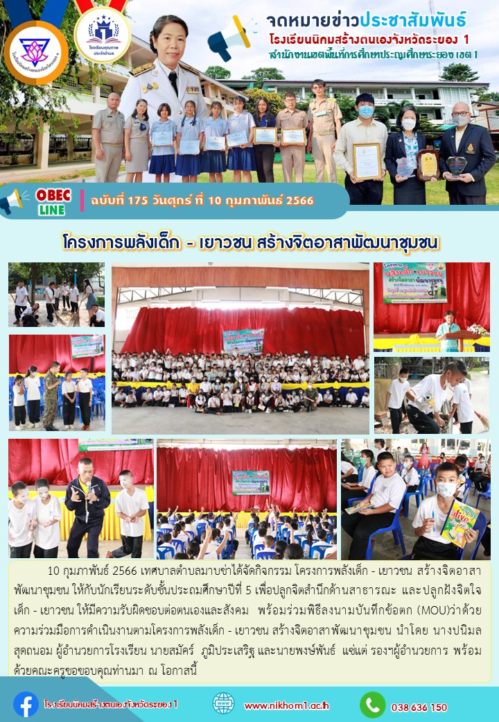 10 กุมภาพันธ์ 2566 เทศบาลตำบลมาบข่าได้จัดกิจกรรม โครงการพลังเด็ก - เยาวชน สร้างจิตอาสาพัฒนาชุมชน ให้กับนักเรียนระดับชั้นประถมศึกษาปีที่ 5 เพื่อปลูกจิตสำนึกด้านสาธารณะ และปลูกฝังจิตใจเด็ก - เยาวชน ให้มีความรับผิดชอบต่อตนเองและสังคม พร้อมร่วมพิธีลงนามบันทึกข้อตก (MOU)ว่าด้วยความร่วมมือการดำเนินงานตามโครงการพลังเด็ก - เยาวชน สร้างจิตอาสาพัฒนาชุมชน นำโดย นางปนิมล สุดถนอม ผู้อำนวยการโรงเรียน นายสมัคร์ ภูมิประเสริฐ และนายพงษ์พันธ์ แซ่แต่ รองฯผู้อำนวยการ พร้อมด้วยคณะครูขอขอบคุณท่านมา ณ โอกาสนี้